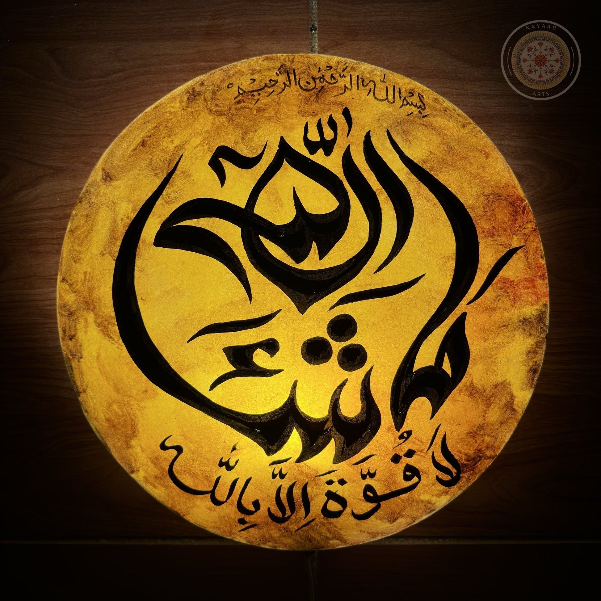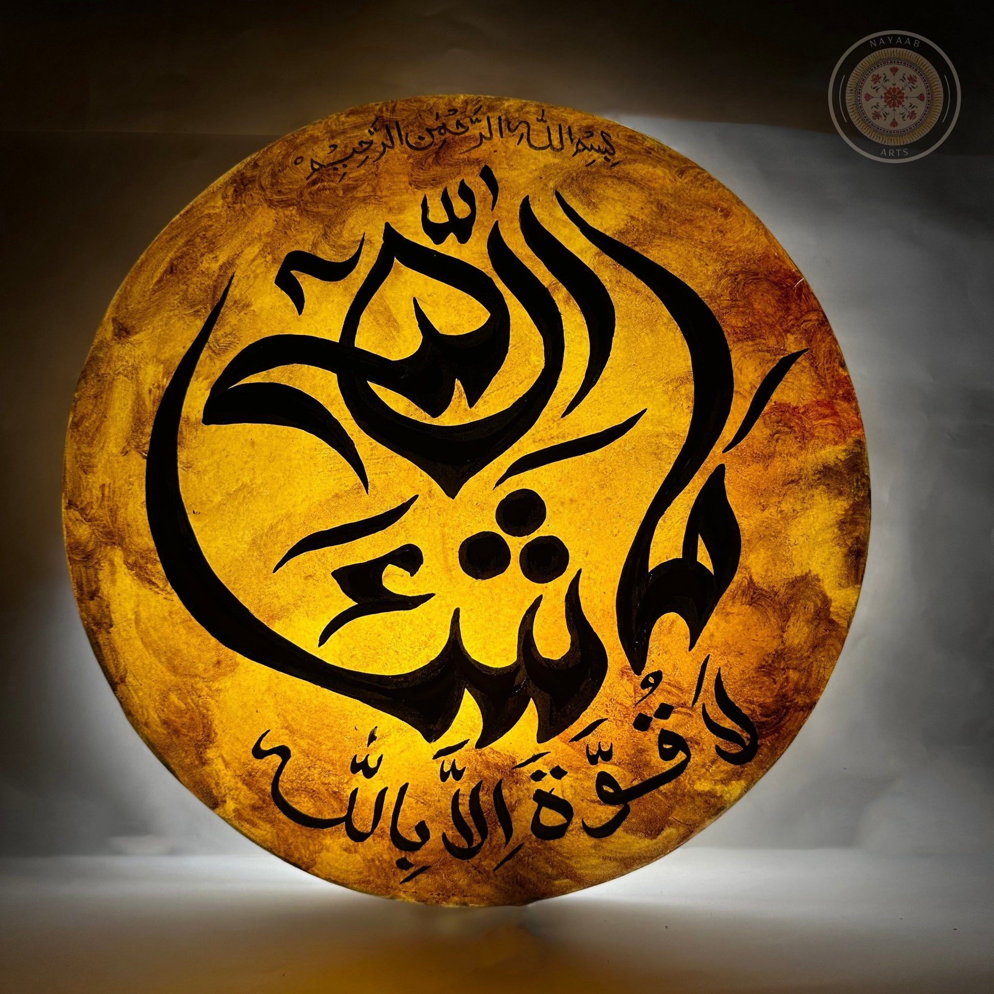 Adorn your walls with this unique Nayaab Arts Hand-Painted Camel Skin Wall Plate Lamp, a masterpiece of faith and craftsmanship. Meticulously created by master artisans from Multan, this lamp features the powerful and beloved phrase, "Ma sha' Allah, La Quwwata illa billah" (What Allah wills, there is no power but with Allah).